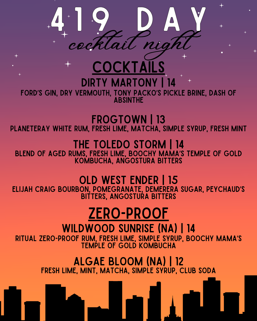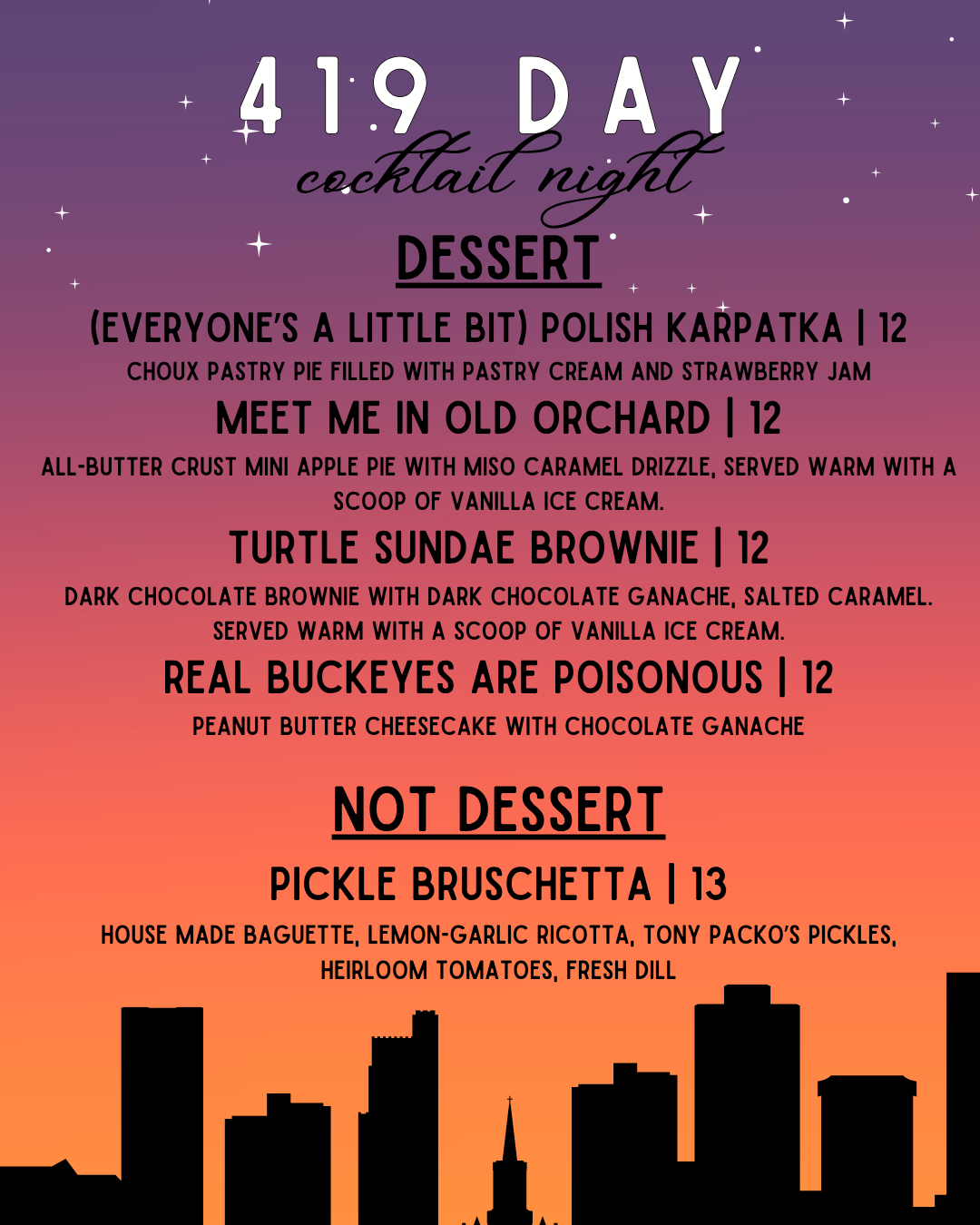 Step into our cozy dessert parlor for a special dessert + cocktail night in honor of 419 Day! We’ll be serving up a menu of craft cocktails, handmade desserts, and small bites inspired by Toledo, and you won’t want to miss it. If you’re due for a date night or a girls’ night, this is your sign to make a reservation (or just stop by). Scroll to see the menu!